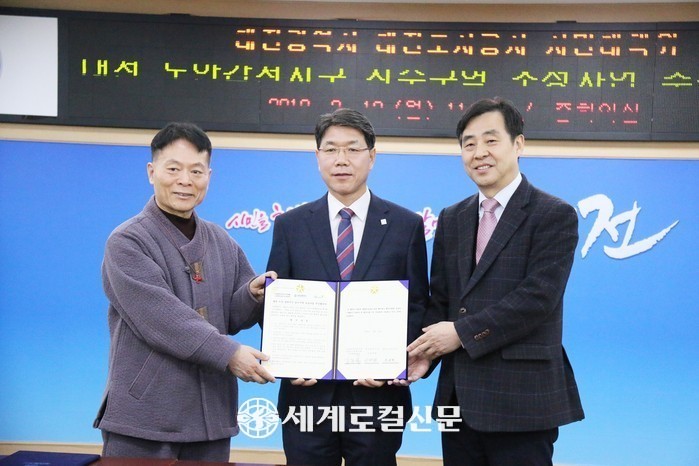 | ▲(왼쪽부터)시민대책위 김규복 위원장, 이재관 대전시장 권한대행, 유영균 대전도시공사 사장이 협약서를 체결하고 기념촬영하고 있다. |