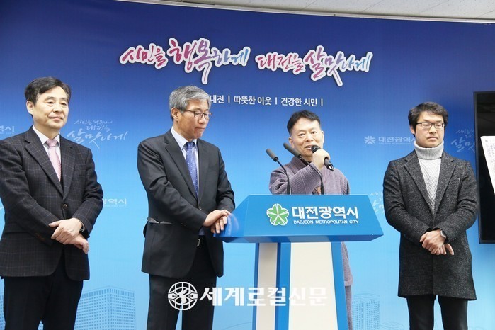 | ▲ 대전시와 도안갑천지구 친수구역개발사업 백지화 시민대책위가 12일 시청에서 갑천지구 친수구역 조성사업 추진 협약식을 열고 협약에 체결했다고 발표하고 있다. |
