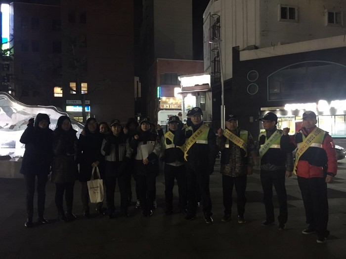| ▲ 제주시와 경찰 등 관계자들이 지난 23일 산지천 일대에서 성매매 호객행위 근절을 위한 야간 단속 활동을 벌이며 기념촬영하고 있다.<사진제공=제주시청> |