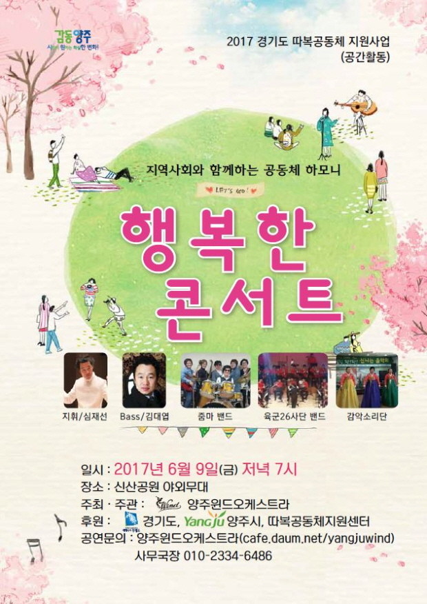 [세계로컬신문 고성철 기자] 경기도 양주시 양주윈드오케스트라는 오는 9일 저녁 7시 양주시 남면 신산공원 야외무대에서 지역사회와 함께하는 공동체 하모니 ‘행복한 콘서트’를 연다.