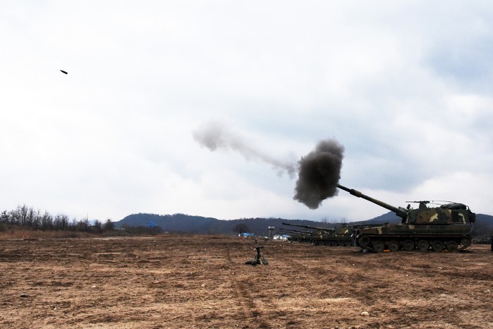경기도 포천시 육군 8사단 산하진(山河震) 포병여단 예하 천둥대대는 지난 6일 강원도 철원군 소재 문혜리 진지에서 실전을 방불케 하는 K-9 자주포 실사격 훈련을 실시했다.