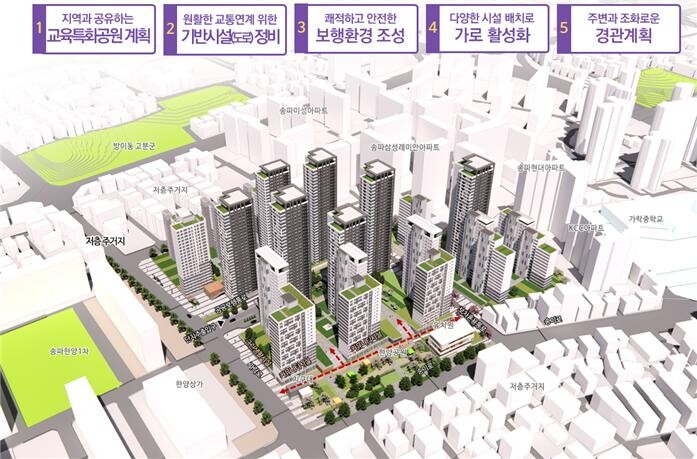 가락로 및 송이로 등 주변 도로 확폭, 쾌적하고 안전한 보행환경 조성을 위한 가로변 보행공간 확보 등 지역 일대 교통여건 개선 방안도 마련했다. 더불어 연접한 송파1차한양아파트와 연계하는 공공보행통로 조성 등 지역 일대 통행 연계도 고려했다.
