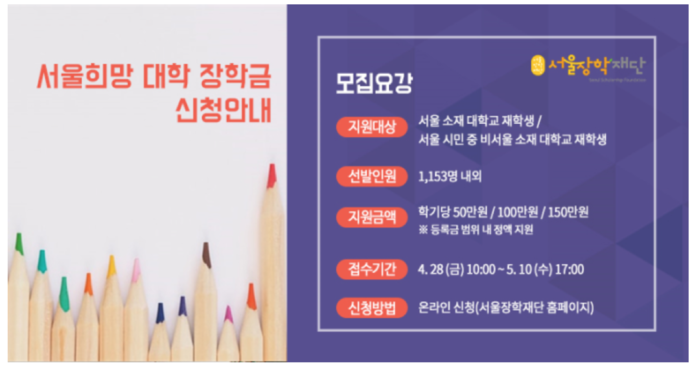신청 기간은 28일부터 5월 10일까지이며, 서울장학재단 누리집에서 개인이 신청하면 된다.