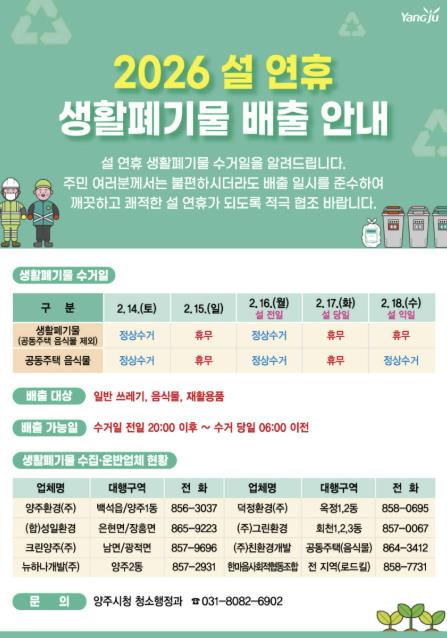 양주시 관계자는 “설 연휴 기간 생활폐기물 발생을 줄이기 위한 시민들의 적극적인 협조가 필요하다”며 “생활폐기물은 정해진 수거 일정에 맞춰 배출해 주시고, 수거일 전날 오후 8시부터 수거일 당일 오전 6시까지 배출 시간을 반드시 지켜달라”고 당부했다.