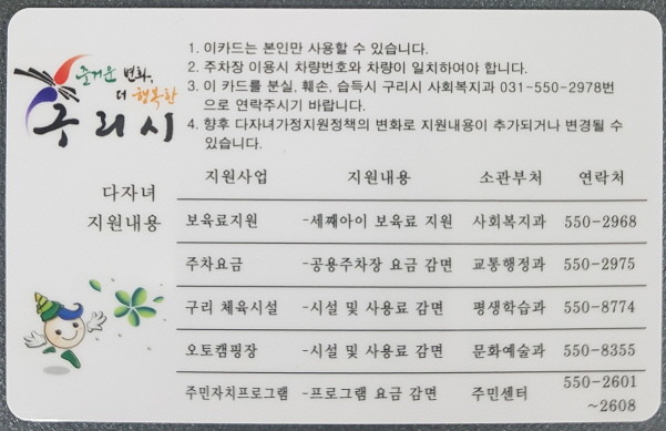 구리시가 추진하는 ‘다자녀 섬김 카드’는 경기도 31개 시군 중 최저 출산율(1.03)을 기록한 바 있는 구리시가 이를 극복하기 위하여 내놓은 다자녀가정 우대 정책이다.