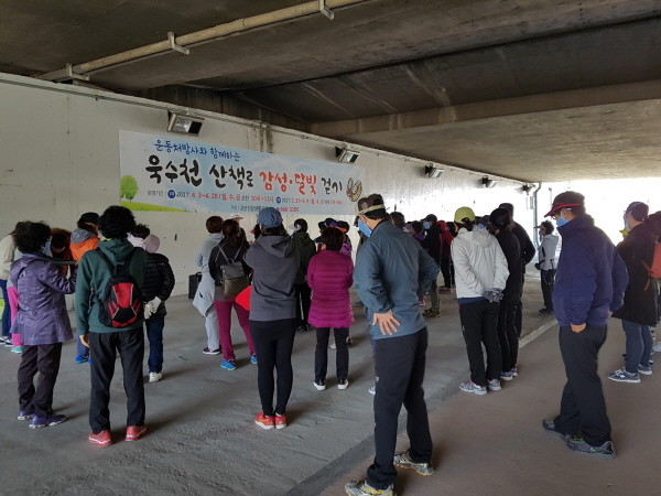 | ▲ 대구시 수성구가 운영하는 욱수천 산책로 감성걷기 프로그램에 참여한 시민들이 몸풀기를 하고 있는 모습.<사진제공=수성구청> |