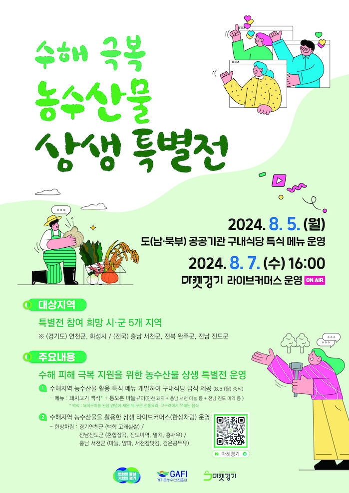 ‘수해 지역 농수산물 팔아주기’는 도 및 산하기관 구내식당 급식에 수해 지역 농수산물을 이용해 반찬으로 제공하고, 경기도 마켓경기 온라인 몰을 통해 온라인 판로개척을 지원하는 방식으로 추진한다.
