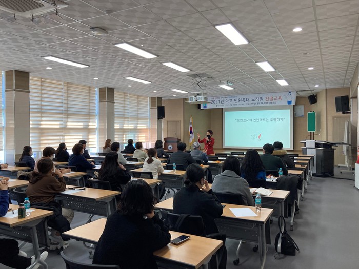 [세계로컬타임즈 강석운 기자] 전라남도완도교육지원청은 29일 완도교육지원청 대회의실에서 학교 민원 응대 교직원을 대상으로 행정환경의 다변화에 따른 수요자 중심의 친절 행정 서비스 의식 향상과 친절한 웃음, 건강한 미소로 밝고 활기찬 직장분위기 조성을 위해 ‘2021년 학교 민원 응대 교직원 친절교육’을 실시했다.