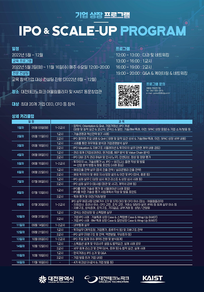 신청기업을 대상으로 4월말까지 적격성을 검토한 후 20개 기업을 선정해 5월 3일 오리엔테이션을 시작으로 11월까지 총 16회에 걸쳐 본격적인 프로그램이 진행된다. 교육과 더불어 IPO가 임박한 우수기업 5개사를 선별해 스케일업 전문 컨설팅도 제공할 계획이다.
