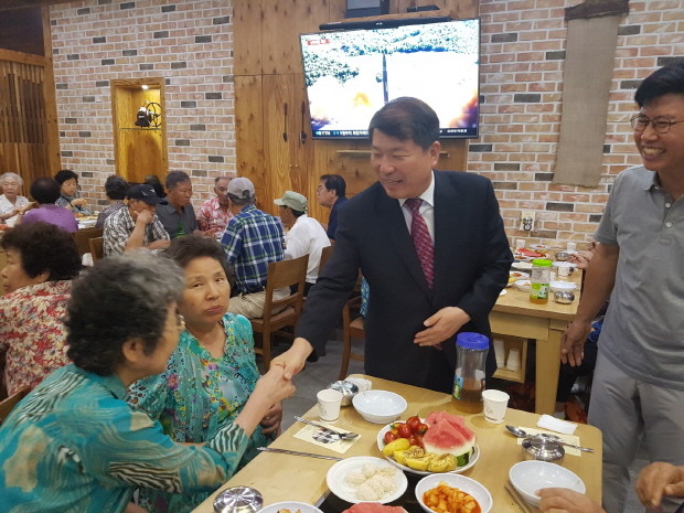 | ▲ 백경현 구리시장(오른쪽에서 두번째)이 지난 18일 갈매동 새마을지도자회·부녀회가 지역 어르신에게 복날을 맞아 행복나눔 식사를 대접하는 행사장을 찾아 인사하고 있다.<사진제공=구리시청> |
