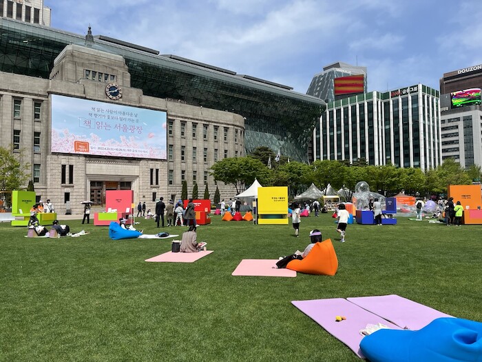 책읽는 서울광장은 넓은 하늘 아래 온 가족이 휴식을 취할 수 있는 ‘도시의 거실’로가족 빈백 등을 설치해 함께 책 읽는 분위기를 자아낸다.