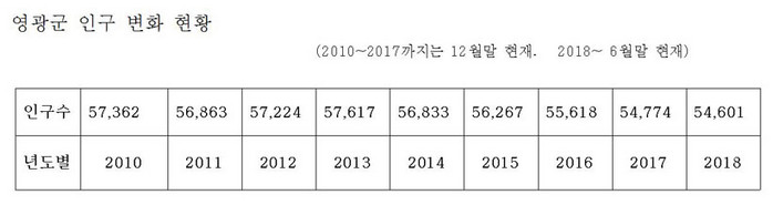 영광군의 인구수는 1968년도에 16만3240명으로 정점을 찍은 뒤 2018년 6월말 현재 5만4601명으로 최근 3년간 해마다 1000여명씩이 감소하는 추세다.