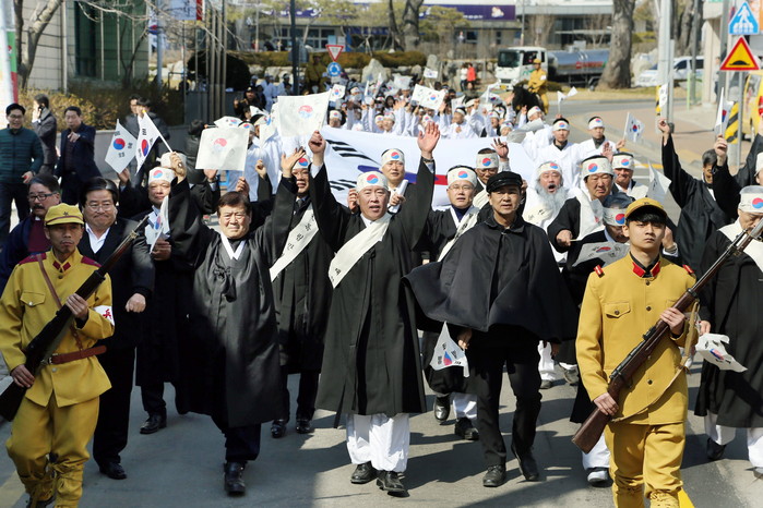 | ▲ 가평군민들이 15일 군청 앞에서 3.15독립만세운동을 재현하고 있다.<사진제공=가평군청> |