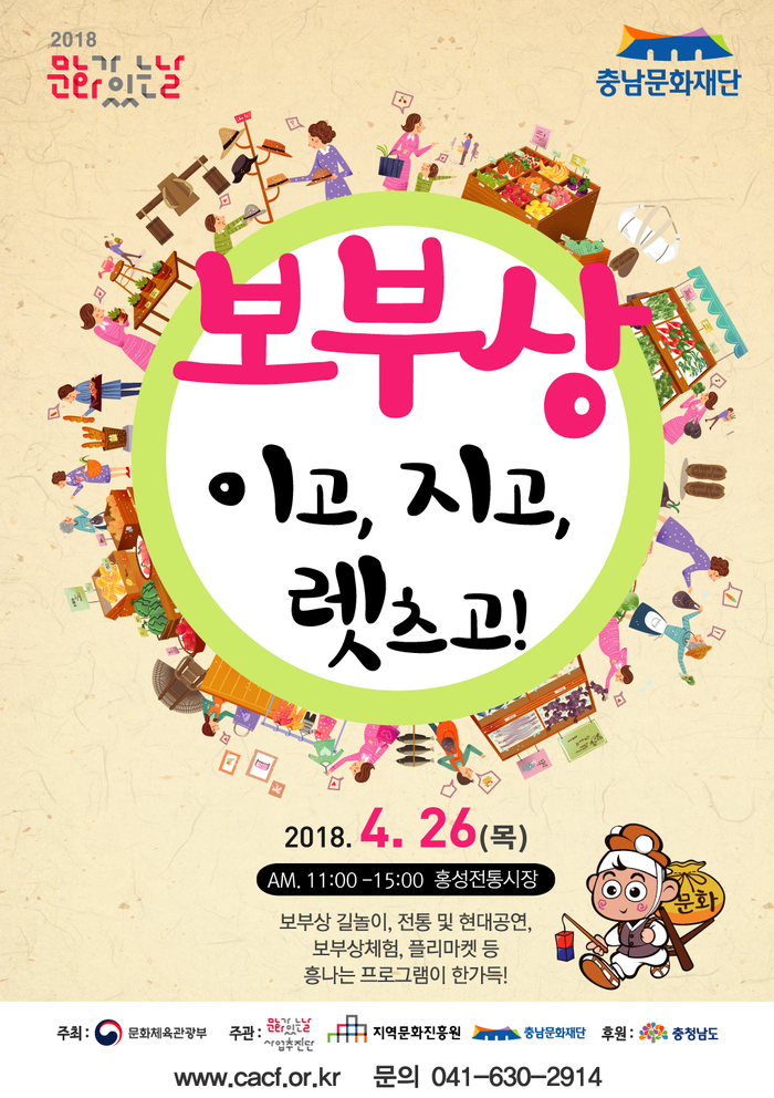 [세계로컬신문 홍윤표 조사위원] 충남문화재단(대표이사 신현보)은 오는 26일 홍성 전통시장에서 2018 문화가 있는 날 '보부상 이고.지고.렛츠고!' 행사를 개최한다.