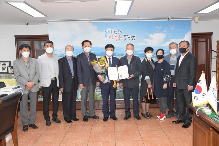 13일 동두천시에 따르면 최 시장은 이 같은 공로를 인정받아 이날 오전 시청 시장실에서 야오잉치 세계자유민주연맹 총재를 대신해 오중기 한국자유총연맹 동두천지부 회장으로부터 자유장을 전수받았다.