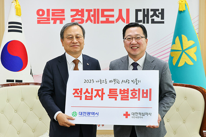 [세계로컬타임즈 민순혜 기자] 대전광역시는 8일 오전 대전시청에서 이장우 대전시장이 대한적십자사 대전세종지사 송하영 회장에게 2023년 적십자 특별회비를 전달했다고 밝혔다.