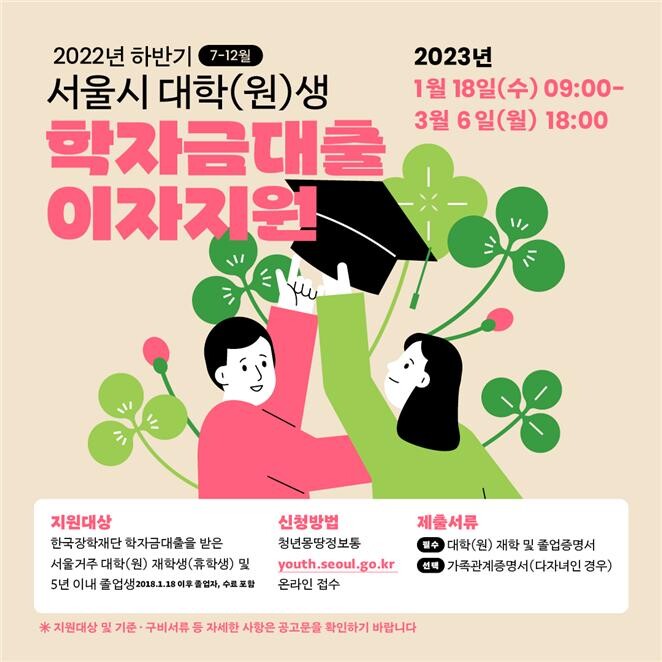 [세계로컬타임즈 이효진 기자] 서울시가 2022년 하반기(7~12월)에 발생한 학자금 대출이자를 지원한다.