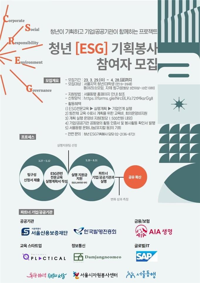 [세계로컬타임즈 이효진 기자] 서울시자원봉사센터는 환경(E) 및 지역 사회(S) 주제의 활동을 청년이 기획·운영하고 기업이 지원하도록 연계해 미래 인재 육성하는 ‘2023 청년 ESG 기획봉사’ 참여자를 모집한다.