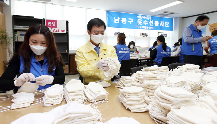 | ▲ 남동구자원봉사센터에서 이강호 남동구청장이 자원봉사자들과 함께 면 마스크를 만들고 있다. (사진=남동구청 제공) |