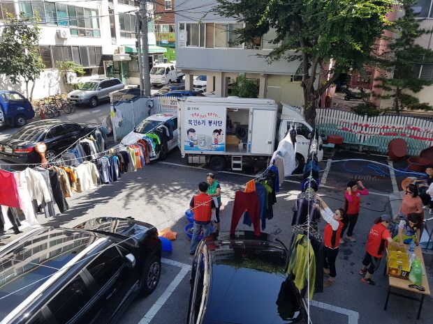 | ▲ 구리시 수택2동에 거주하는 독거어르신을 위해 봉사단체 회원들이 20일 빨래를 하고 있다.<사진제공=구리시청> |