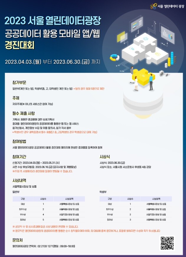 [세계로컬타임즈 이효진 기자] 서울시는 학생부터 시민 누구나 열린데이터광장의 공공데이터를 활용해 모바일 앱과 누리집을 개발함으로써 창의성과 기술적 전문성을 보여 줄 수 있는 기회의 경진대회를 개최한다.