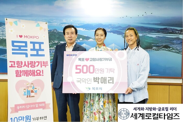 [세계로컬타임즈 김명진 기자] 평소 고향 목포에 애향심이 깊은 국악인 박애리씨가 지난 12일 목포시에 고향사랑기부금 연간 상한액인 500만원을 기탁했다.