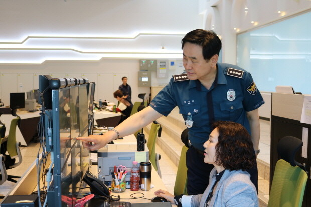 | ▲지난 25일 김충환 남양주경찰서장이 CCTV관제센터를 직접 방문해 모니터 요원과 이야기 하고 있다.<사진제공=남양주경찰서> |
