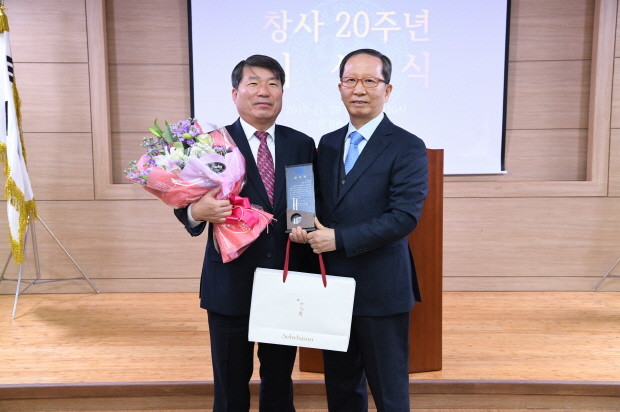 | ▲29일 경기도 수원시 경기방송국에서 개국 20주년 기념식에서 백경현 구리시장(왼쪽)이 최승대 경기방송 대표이사로 부터 감사패를 받고 있다. |