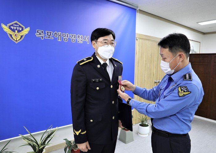 | ▲ 임재수 목포해양경찰서장이 윤대현 경위에게 표장을 달아주고 있다.(사진=목포해경) |