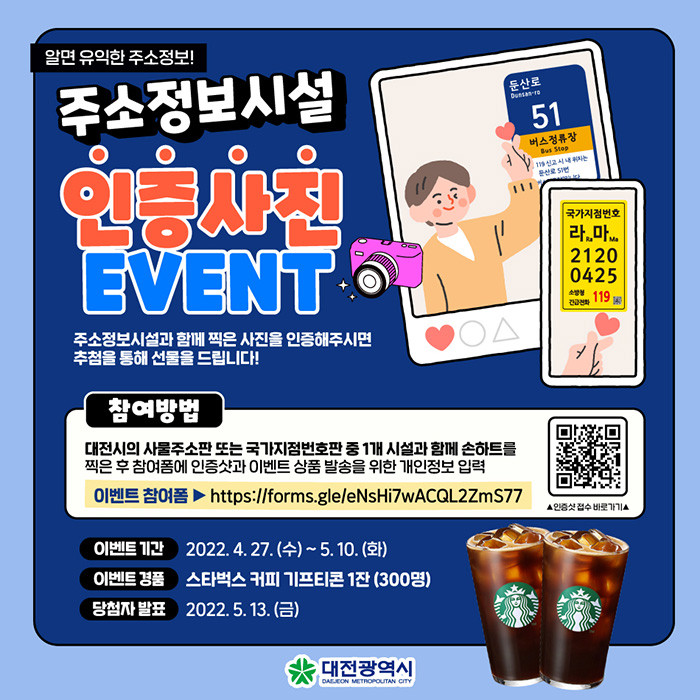 주변 곳곳에서 볼 수 있는 대전시 관내 사물주소판 또는 국가지점번호판과 함께 손하트를 하고 인증샷을 올린 참가자를 대상으로 추첨을 통해 300명에게 모바일 커피쿠폰을 지급할 계획이다.
