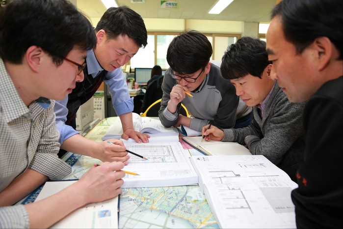 | ▲ 미추홀구 건축분야 규제개혁 동아리 관계자들이 과제를 논의하고 있다.(사진=미추홀구 제공) |