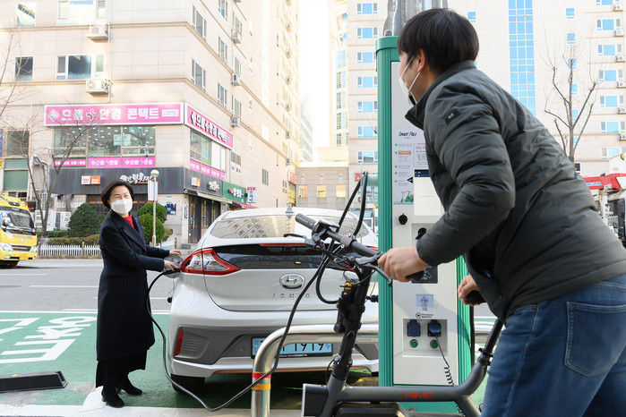 ▲ ‘가로등 활용 전기차 및 퍼스널모빌리티 충전기’에서 양천구만아 충전하고 있다.[사진=양천구] |