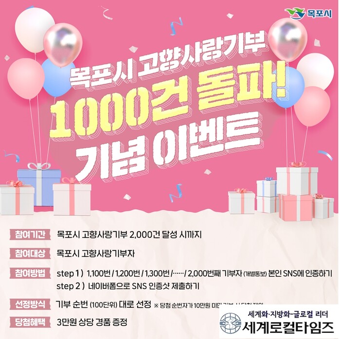 [세계로컬타임즈 김명진 기자] 목포시가 올해 첫 시행된 「고향사랑기부제」 기부건수 1,000건 돌파를 기념해 감사 이벤트를 추진 중이다.