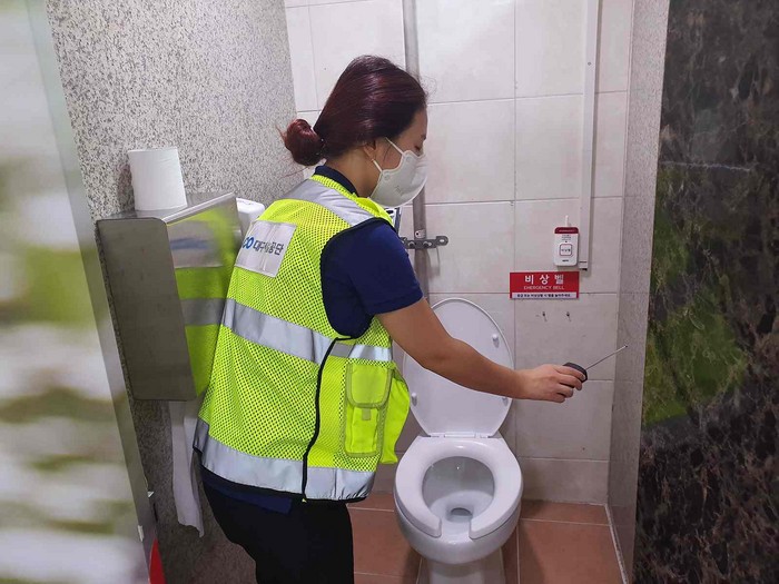 | ▲대구시설공단 직원이 다중이용시설의 여성화장실에 불법촬영기기 설치 등 점검을 하고 있다. (사진=대구시설공단 제공) |