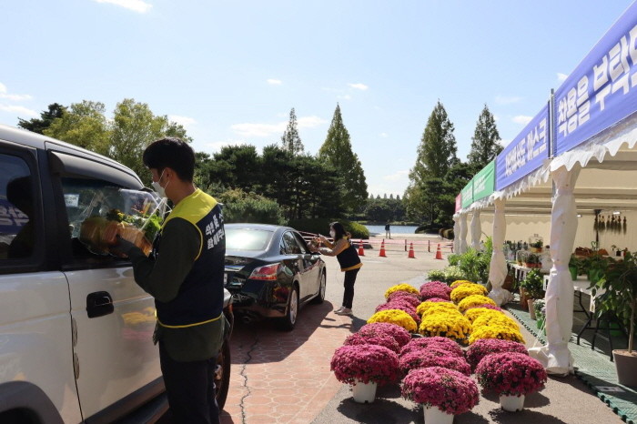 드라이브 스루 및 워킹 스루로 꽃을 살 수 있는 화훼 판매장에는 추석 연휴 기간 국화, 공기정화식물, 다육식물 등을 구매하려는 시민들의 발길이 이어졌다.