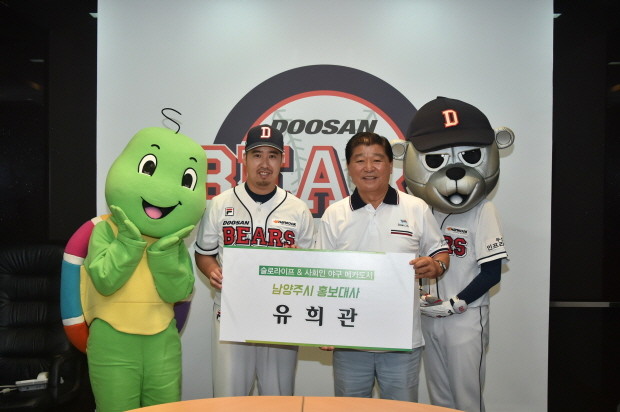 | ▲ 이석우 남양주시장(오른쪽 두번째)이 지난 25일 두산베어스 투수 유희관 선수를 슬로라이프 국제대회 홍보대사로 위촉하고 기념 촬영 하고 있다.<사진제공=남양주시청> |