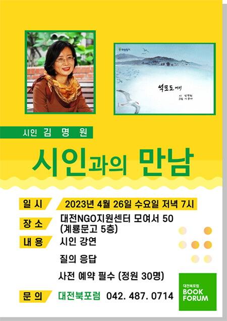 대전북포럼에 따르면 26일 대전NGO지원센터에서 김명원 시인의 ‘석모도에서’ 시에 이용나 화가가 그린 ‘시 그림책’ 을 제작해 초청 강연과 함께 원화 전시한다.