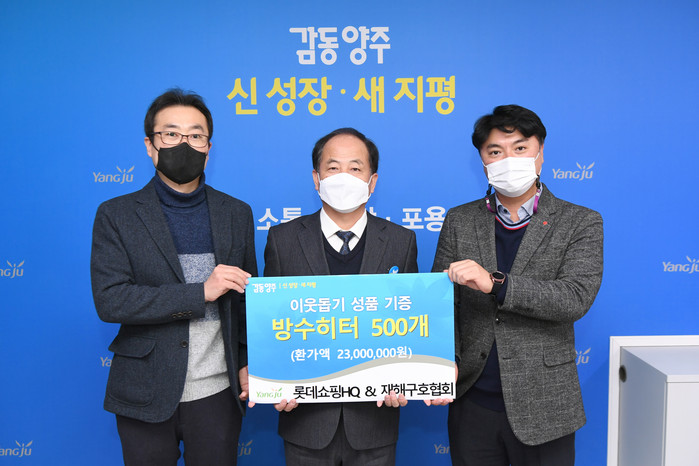 | ▲롯데쇼필HQ&재해구호협회에서 난방 취약계층을 위한 방수히터 500개(환가액 2,300만원)를 기부했다.(사진=양주시) |
