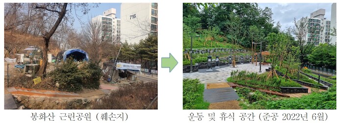 ▲ 지난해 6월 중랑구 봉화산근린공원에 장기간 무단경작으로 방치돼 있던 약 3,500㎡의 훼손지에 녹지를 회복하고 경관을 개선하는 운동 및 휴식 공간을 설치했다. (사진=서울시) |