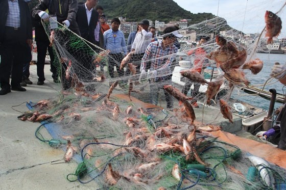 | ▲ 신안군 홍도에서 다음달 13일과 14일 이틀간 불볼락축제를 연다. 사진은 항구에서 그물에 걸린 불볼락을 털어내는 작업을 하고 있다.<사진제공=신안군청> |