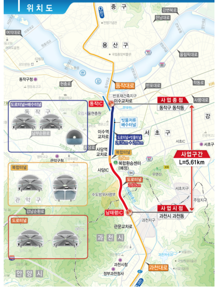 지난 19일 기획재정부 민간투자사업심의위원회에서 국내 최초로 도로터널과 빗물배수터널을 함께 짓는 ‘이수~과천 복합터널’ 건설이 민간투자사업 심의를 통과하면서 오는 2025년 착공 등 공사 일정이 구체화됐다.