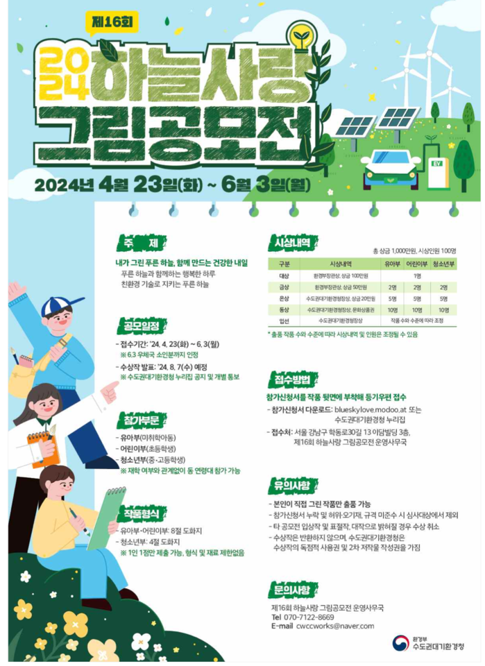 올해로 16회를 맞는 하늘사랑 그림 공모전의 주제는 ‘내가 그린 푸른 하늘, 함께 만드는 건강한 내일’이며 세부 주제는 △푸른 하늘과 함께하는 행복한 하루 △친환경 기술로 지키는 푸른 하늘이다.