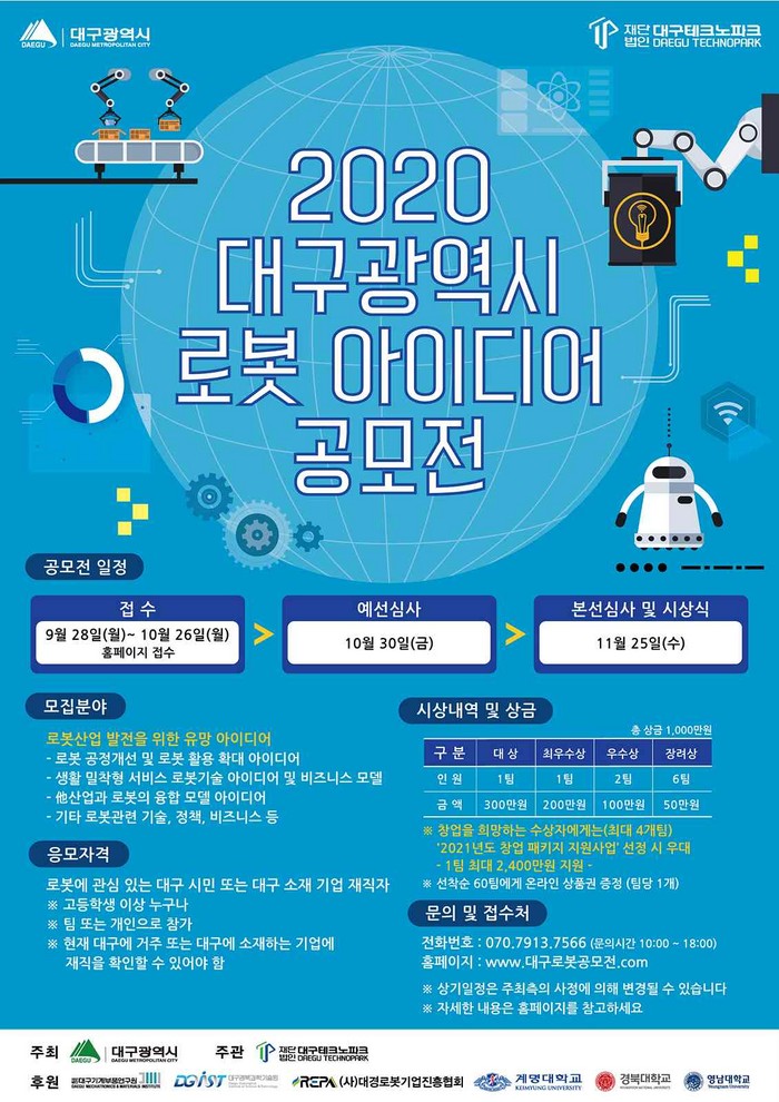 대구시는 대구테크노파크와 제1회 ‘2020 대구광역시 로봇 아이디어 공모전’을 개최한다고 13일 밝혔다. 시는 최초로 개최하는 이번 로봇 분야 공모전에서 발굴된 유망 아이디어를 창업지원 사업으로 연계 지원해 로봇산업의 저변을 넓히고 다변화하는 것을 목표로 하고 있다.