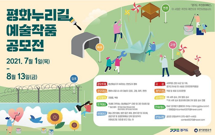 [세계로컬타임즈 이호 기자] 경기도와 경기관광공사는 평화누리길을 평화와 예술이 어우러지는 공간으로 만들 참신한 아이디어를 가진 청년 예술가들을 대상으로 ‘평화누리길 예술작품 공모전’을 개최한다.