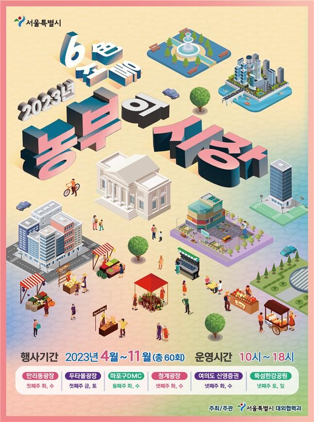 [세계로컬타임즈 이효진 기자] 서울시는 18일부터 11월 15일까지 청계광장, 뚝섬한강공원, 여의도 신영증권 앞, 만리동광장, 두타몰광장, 마포구 DMC 6개소에서 전국 60여개 시·군 100여 농가가 참여하는 ‘2023년 농부의 시장’을 개장한다.
