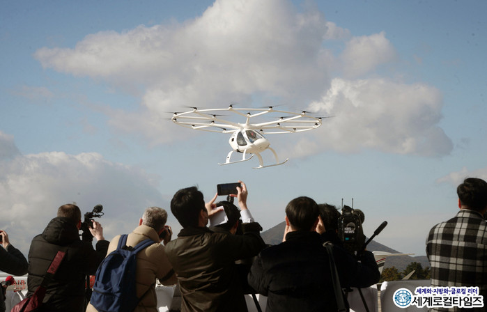 | ▲11일 서울 김포비즈니스항공센터에서 진행된 ‘도심항공교통(UAM) 비행 시연 행사’에서 블로콥터가 시험 비행을 하고 있다. ⓒ한국국토정보공사 |