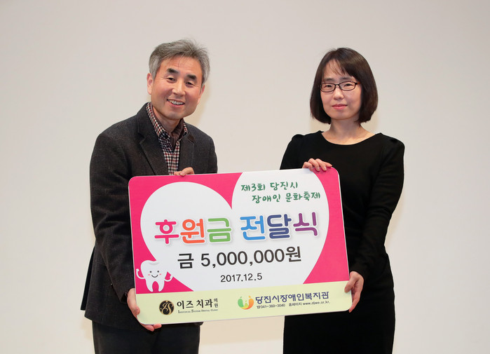 | ▲ 충남 당진 이즈치과 관계자가 당진시장애복지관에 후원금을 전달하고 있다. |