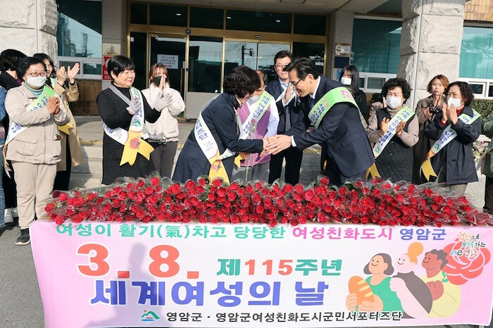 이날 여성단체 및 여성친화도시서포터즈단은 지역민들에게 성평등 실현 의지를 담은 기념 편지가 부착된 장미꽃 300여 송이를 전달하고 「여성친화도시 영암」을 홍보하는 등 ‘세계 여성의 날’의 의미를 되새겼다.