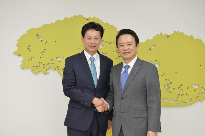 | ▲ 김종천 포천시장(왼쪽)과 남경필 경기도시자가 협력을 다짐하며 악수하고 있다.<사진제공=포천시청> |