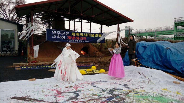 | ▲ 예술인들이 완주군에 위치한 세계막사발미술관 앞에서 미술관 폐관에 항의하는 퍼포먼스를 벌이고 있다. |